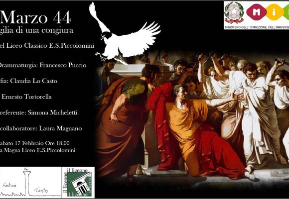 Il prof. Moreno Lifodi, nostro associato e presidente della Delegazione AICC Siena, ci comunica che sabato 17 febbraio 2018, alle ore 18, andrà in scena nell’Aula Magna del nostro storico Liceo Classico “Enea Silvio Piccolomini“, lo spettacolo “14 marzo 44, alla vigilia di una congiura”, con la regia di Francesco Puccio e la coreografia di Claudia Lo Casto, momento conclusivo del laboratorio teatrale “L’antico fa testo”, patrocinato dal Centro AMA e dal MIUR. Protagonisti, come sempre, gli studenti del biennio e del triennio, piccoli e grandi. In scena, quest’anno, le trame del potere attraverso le vicende e le passioni di Giulio Cesare, uomo spregiudicato, avido di potere, tanto ambizioso e determinato da non fermarsi neppure di fronte al pericolo annunciato.