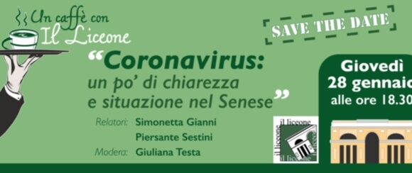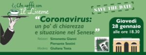 Inizieremo il 28 gennaio alle ore 18,30 con ‘CORONAVIRUS: UN PO’ DI CHIAREZZA. LA SITUAZIONE NEL SENESE’ per fare un po’ di chiarezza sulla situazione ‘coronavirus’ nel senese. Ospiti della Presidente Giuliana Testa la Dr.ssa Simonetta Gianni, il Dr. Piersante Sestini e il Dr Mirko Bindi. Saranno due chiacchiere in compagnia di esperti per essere sempre più aggiornati. Sono invitati a partecipare tutti gli associati, gli studenti, i docenti e tutti coloro che tramite l’associazione vogliano sentire qualcosa in più sull’argomento.