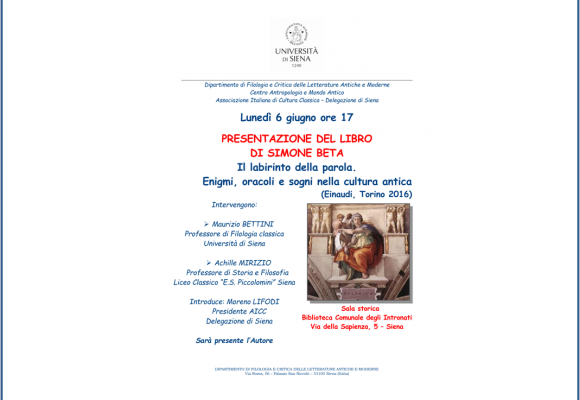 Ritenendo di fare cosa gradita, si comunica che il giorno lunedì 6 giugno, p.v. alle ore 17, presso la Sala storica della Biblioteca Comunale degli Intronati, Via della Sapienza, 5 – Siena, sarà presentato il libro di Simone Beta